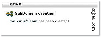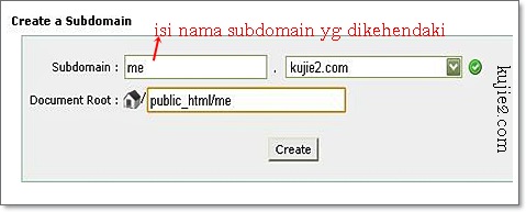 Bahagian create subdomain, isikan nama subdomain yang ingin kita miliki. Jika kita isi blog, url akan menjadi http://blog.domain.com. Untuk contoh ini saya gunakan http://me.kujie2.com. Document root akan keluar public_html/me. Klik create.