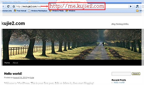 Inilah blog tersebut dengan default theme wordpress – Twenty Ten. Bolehlah login dengan username dan password yang dicipta tadi.