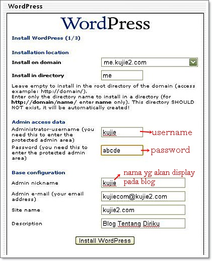 Pilih domain yang kita create tadi dan Install in directory . Isikan contoh semua data termasuk Site Name dan Description ( boleh tukar di dashboard WP ). Selesai mengisi maklumat tersebut, klik Install WordPress.