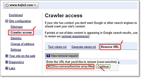 3. Crawler access > Remove url > paste url yang dicopy dari Crawl Error tadi.