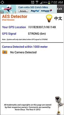 Selepas klik application ini, AES Detector  akan mula mengesan kamera AES yang terdapat berdekatan.   Anda perlu hidupkan  GPS  untuk memboleh AES Detector ini berfungsi.