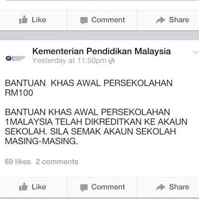 Dapat bantuan RM100 sudah cukup membantu untuk meringankan biaya pendidikan anak. Semoga program ini kedepannya terus berjalan …