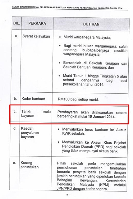 Merujuk kepada pekeliling Kementerian Pendidikan Malaysia , tarikh bayaran bantuan RM 100 kepada pelajar sekolah rendah dan menengah akan dibuat pada 15 Januari 2014 ( Rabu) secara berperingkat.