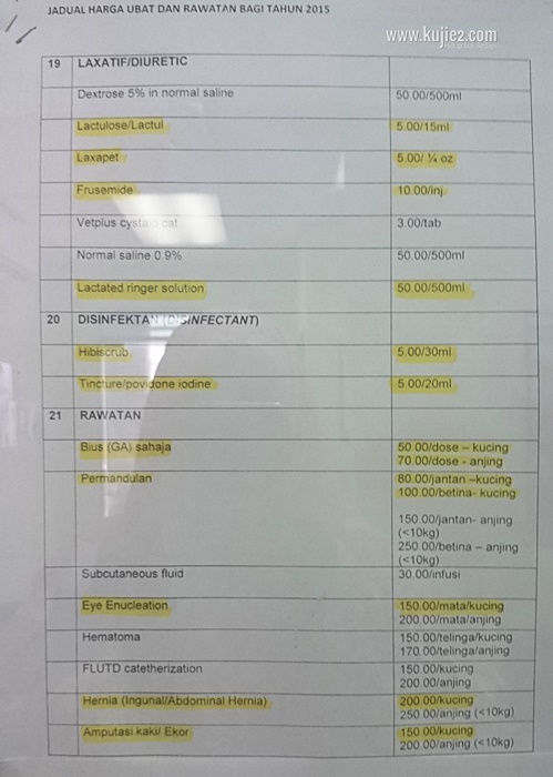 Saya nampak senarai harga ubat dan rawatan di klinik haiwan kerajaan bagi tahun 2015 terpampang di papan kenyataan. Saya snap gambar dan cuba menulis semula di blog untuk panduan diri sendiri dan rakan-rakan yang memerlukan. Maaf kalau ada typo yang tak disengajakan…. susah juga nak mengeja nama ubat-ubatan ni.