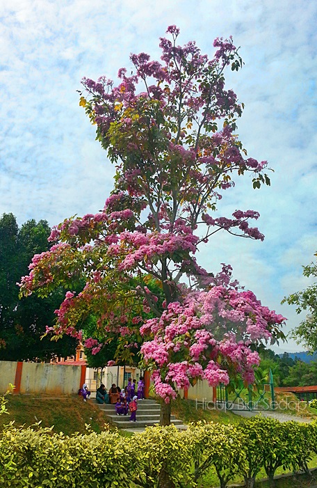 Sampai ke sekolah, disepanjang laluan boleh nampak pokok-pokok bunga yang cantik seperti Bunga Sakura. Saya tak tahu apa nama bunga yang kembang semusim ini, tetapi apabila deretan pokok-pokok ini mengeluarkan bunga serentak dengan warna putih , pink dan purple hari menjadi ceria.