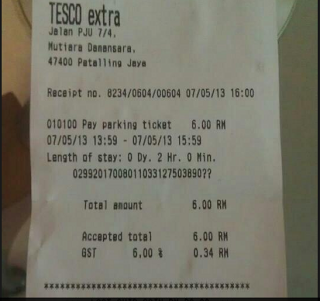 GST dalam resit parking tesco itu merujuk kepada Government Service Tax (6%)