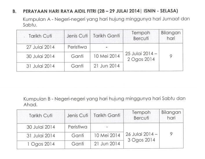Sekolah akan mula bercuti Hari Raya Aidilfitri 2014 pada 26 ( Sabtu ) Julai hingga 3 Ogos ( Ahad ) 2014 bagi sekolah Kumpulan B . Bagi sekolah Kumpulan A, cuti hari raya puasa 2014 bermula pada 25 Julai ( Jumaat ) sehingga 2 ogos ( Sabtu ) 2014.