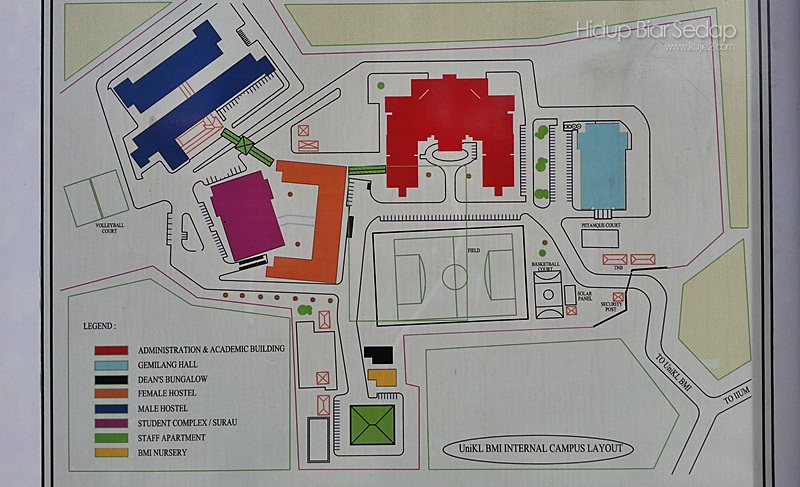Layout kampus UniKL BMI. Bangunan utama Pentadbiran dan Akademik ( merah ), Dewan Gemilang yang berwarna biru , asrama perempuan UniKL BMI berwarna oren, asrama lelaki berwarna biru , komplek pelajar yang menempatkan cafe dan surau berwarna purple dan apartmen kakitangan berwarna hijau.