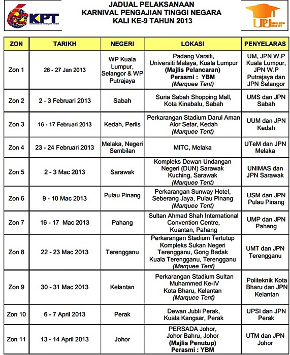 JADUAL PELAKSANAAN KARNIVAL PENGAJIAN TINGGI NEGARA KALI KE-8 TAHUN 2013 ( update 13/1/2013)