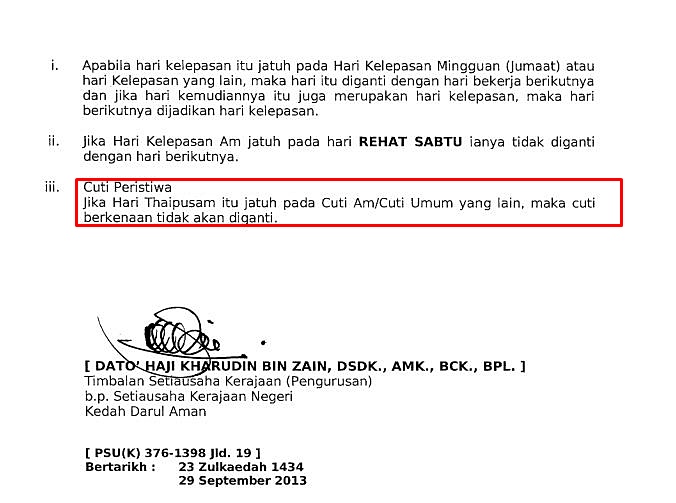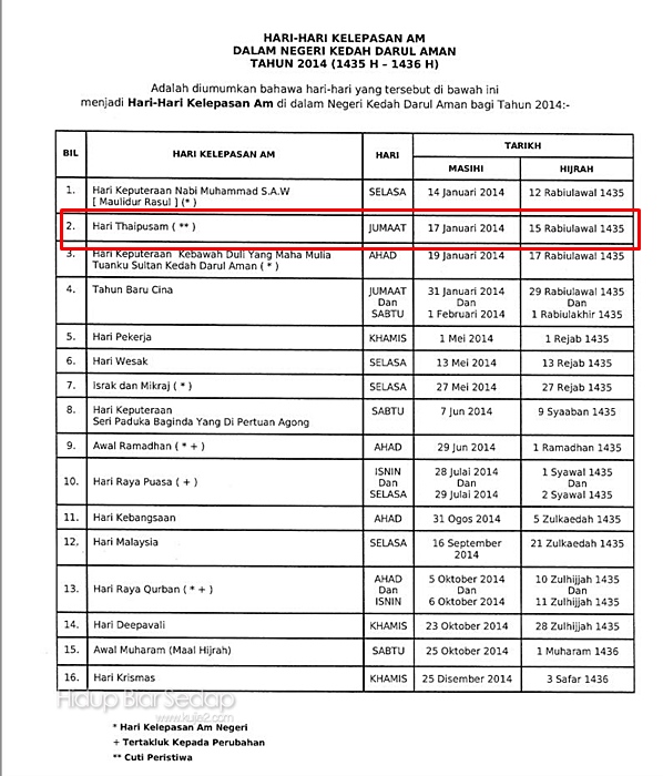 Tetapi daripada sumber Laman Web Pejabat Setiausaha Kerajaan Negeri Kedah, Negeri Kedah akan bercuti pada hari Thaipusam ( 17 Januari 2014 ) sebagaiย Cuti Peristiwa.