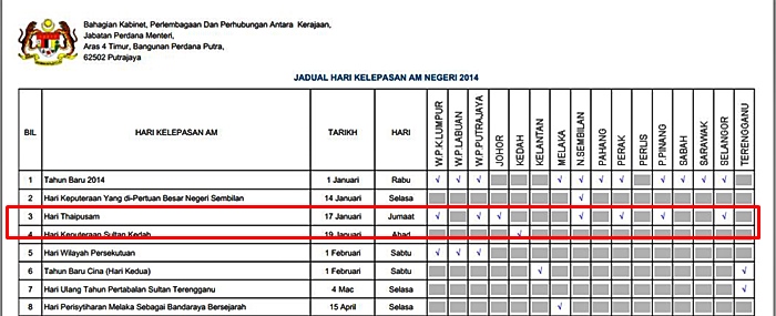 Merujuk kepada entri saya yang lepas – Cuti Am Malaysia 2014 seperti yang dikeluarkan oleh Bahagian Kabinet, Perlembagaan dan Perhubungan Antara Kerajaan, Jabatan Perdana Menteri, negeri-negeri yang bercuti pada Thaipusam 2014 ialah