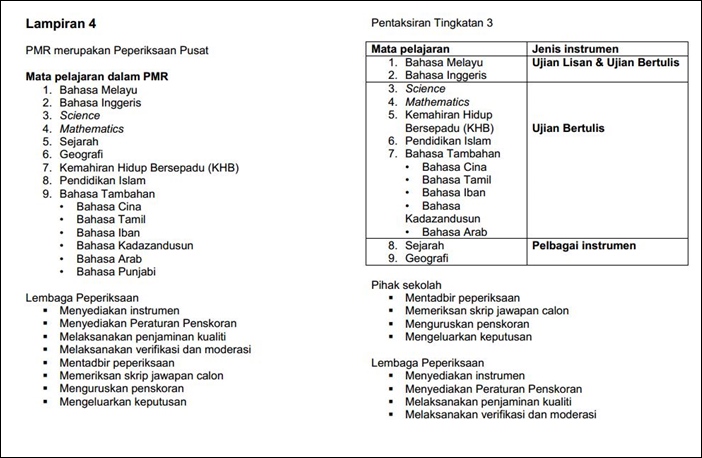 - PT3 bagi mata pelajaran Science, Mathematics, Pendidikan Islam, Kemahiran Hidup, Bahasa Arab, Bahasa Cina, Bahasa Tamil, Bahasa Iban dan Bahasa Kadazandusun akan menggunakan instrumen pentaksiran ujian bertulis sahaja.