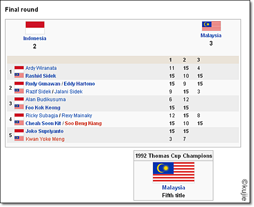 Tengok video klip ini – sangat bersemangat. Sukar untuk digambarkan . Pertandingan akhir Piala Thomas pada 16 Mei 1992 merupakan kenangan manis bagi Malaysia kerana selepas 25 tahun menunggu akhirnya Piala Thomas berjaya dirangkul apabila menundukkan Indonesia 3-2. Pemain Malaysia pada waktu itu Rashid Sidek, Foo Kok Keong, Kwan Yoke Meng, Cheah Soon Kit-Soo Beng Kiang dan Razif Sidek-Jalani Sidek telah terukir dalam sejarah.
