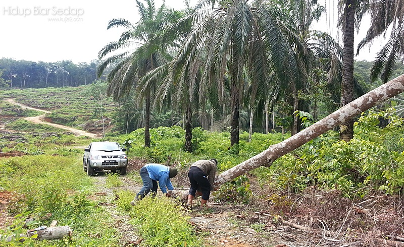 Dalam perjalanan ke kebun, jalan dihalang dengan pokok yang tumbang. Terpaksa potong dan alihkan.