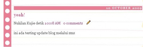 Percubaan saya mengupdate blog melalui SMS telah berjaya. Bukan blog ini tetapi MyDearDiary blog peribadi saya di blogspot. Hanya perlukan handphone asas yang ada fungsi SMS. Percubaan ini berjaya dengan perkhidmatan yang kita daftar dengan dapat.com. Ini bukan perkhidmatan percuma ye, kalau tak salah saya setiap sms dicaj rm 0.30.