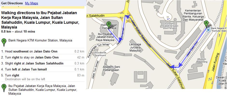 Kemudian terfikir untuk menaiki komuter, saya pilih ” walking” dari KTM Bank Negara ke JKR Jln. Sultan Salahhudin. Jaraknya 0.8km mengambil masa kira-kiran 10 minit.