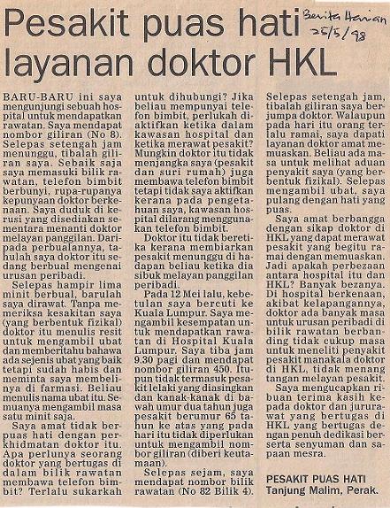 Maksudnya saya bukanlah buta hati hingga gagal menilai kewajaran perkhidmatan yang saya perlu dapatkan. Saya menilai setiap satu kes bergantung pada situasi tersebut. Kerana itu saya menulis surat penghargaan di forum Berita Harian bertarikh 25/05/1998 ditujukan kepada para doktor dan jururawat HKL di atas sikap dedikasi mereka bertugas pada waktu itu.