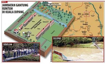 Melihat gambar ini saya dapat bayangkan air sungai yang keruh likat membuak-buak. Kenapalah dalam musim hujan ribut petir seperti ini mahu dianjurkan perkhemahan di kawasan sungai. Kami yang hidup dengan sungai pun masih gerun dan takut setiap kali selepas hujan lebat. Kenal isyarat alam dan belajar hidup dengannya . Dalam keadaan musim hujan yang belum berakhir, arus deras sungai menjadikan kedudukan tebing mudah terhakis dan mengikut cerita jambatan ini juga baru sebulan disiapkan untuk projek perkhemahan 1Malaysia.