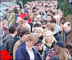 Lebih 3,000 beratur panjang untuk ‘merebut’ hanya 150 kerja kosong menyebabkan berlaku kesesakan jalan raya sejauh lapan kilometer.