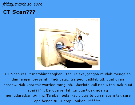 tahun lepas, mama sy pun kena kanser ovari, masa tu tuhan saja yg tahu betapa sedihnya kami bila mangetahui keadaan mama sbb sebelum ni tak pernah ada tanda2 kanser yg muncul,,tup2 sakit perut pegi chech docktor kata kena kanser ovari stage-4. kini, mama telah pun menjalani operation dan kemo sebanyak 5 kali,,dah sihat…tapi apa yg membuatkan sy takut skg adalah doctor kata dia kini perlu menjalani rawatan CT Scan semula….takutnya