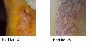 letak bebanyak minyak gamat biar luka tu kering…pastuh bila dah kering letak krim vitamin E……biar parut takde dan tumbuh kulit baru!