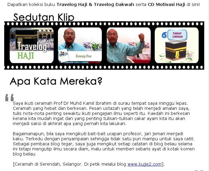 Sepanjang minggu lepas saya mengesan beberapa pengunjung yang datang dari traveloghaji.com. Rupanya secebis catatan entri blog saya di sini telah dipetik oleh traveloghaji.com yang menjual VCD Travelog Haji Prof Muhd Kamil Ibrahim. Buku best seller beliau yang lain adalah Travelog Haji : Mengubah Sempadan Iman dan Travelog Dakwah.