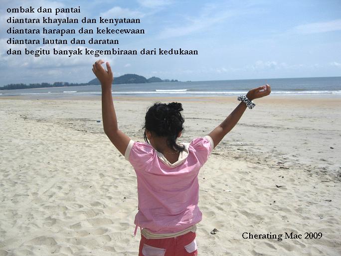Gadis itu melangkah menyusuri pantai dengan telanjang kaki. Di antara gemuruh ombak, desir angin, dan langit yang terbentang. Rambut panjangnya terurai dimainkan angin nakal. Ombak yang menerpa langkahnya, menghapus setiap jejak yang ditinggalkan di atas pasir putih. Ombak menghapusnya. Dan ombak ibarat harapan, rindu, cinta dan kasih sayang. Sesekali melangkah, hamparan pasir ditendangnya. Butiran putih itu berhamburan terbawa angin. Namun harapannya moga rindu dan cinta tidak ingin seperti pasir yang hilang terbawa angin, atau seperti karang yang perlahan akan hilang terkikis oleh debur ombak lautan.