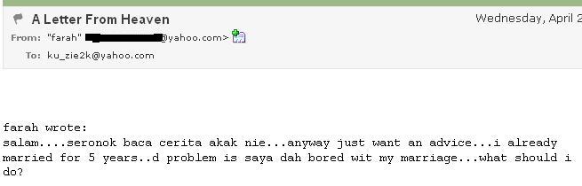 Hmm….usia perkahwinan yang muda ni memang amat mencabar. Tie tak boleh nak beri pandangan sebab tak tahu punca ‘boring’nya tu. Harap2 dia dapat jelaskan supaya kita semua boleh membantu.