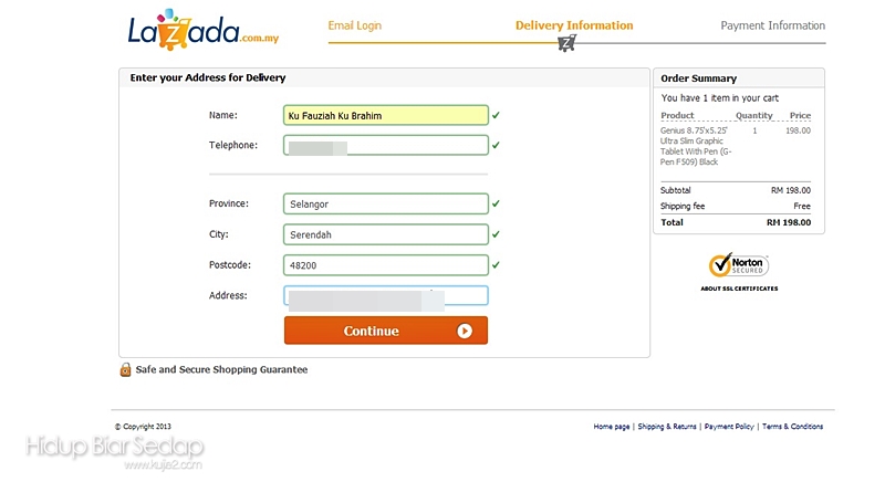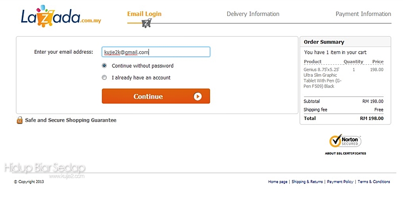 Kalau belum daftar dengan Lazada pun boleh beli. Isi saja email dan klik continue.