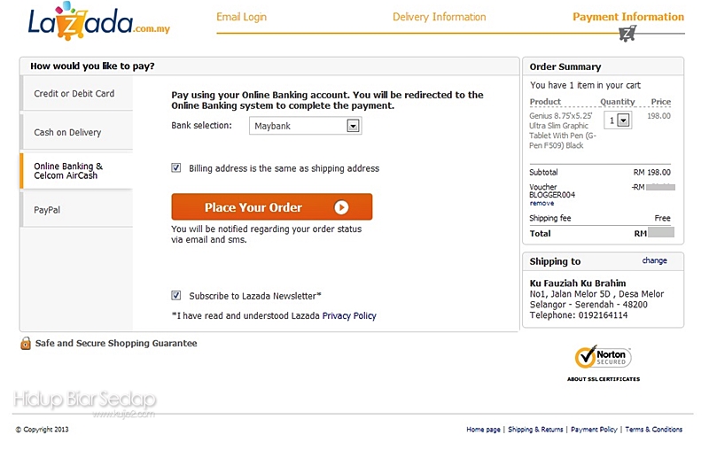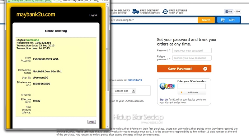 Saya membeli belah di Lazada menggunakan Maybank2u. Ambil masa beberapa minit sahaja kalau TAC nombor tu cepat dapat. Selepas berjaya membuat pembelian, notification juga akan dihantar ke email bersama nombor Order Tracking.