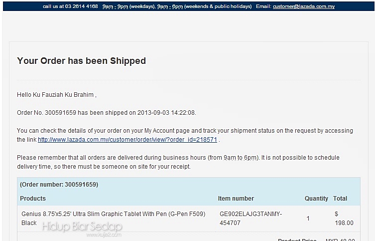 Bila barang yang dipesan telah dihantar, saya dapat satu email pemberitahuan. Kita tau flow chart perjalanan barang pesanan dengan jelas dan boleh buat anggaran bila akan menerima barang tersebut. Senang nak tunggu di rumah.