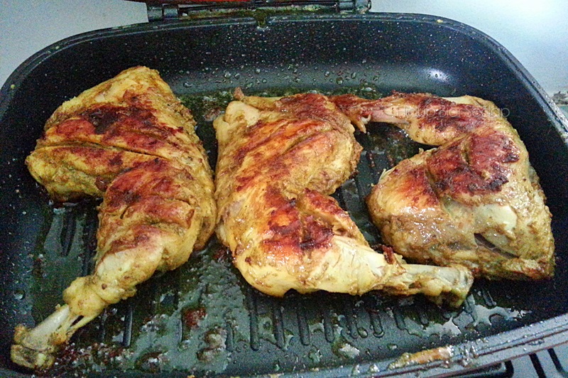 Nasi Kabsa boleh dimakan bersama ayam – perap ayam dengan serbuk ketumbar, serbuk jintan manis, serbuk lada hitam, garam dan kunyit. Panggang gunakan Pemanggang Ajaib. Percik-percikkan minyak zaitun.