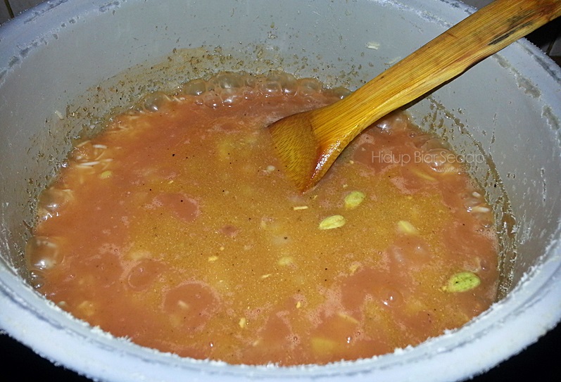 - Masukkan air rebusan kambing. Masukkan sos tomato dan masak hingga kering.