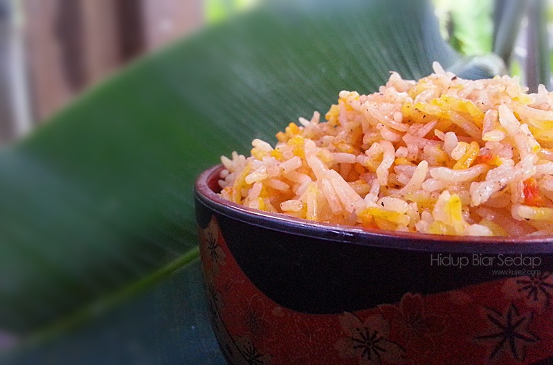 - 3 cawan beras Basmati, saya guna Beras Basmathi King Jasmine Special Super Long Aromatic Variety direndam 30 minit dan ditos
