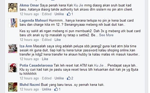 Kawan-kawan saya di Facebook juga berkongsi maklumat mengenai cara nak dapatkan nombor PIN kad ATM kalau kita terlupa. Memang tak ada cara lain selain pergi ke cawangan Maybank dan mohon kad ATM yang baru dan bayar RM 12. Antara sebabnya adalah kerana pihak Maybank tak ada kuasa untuk memasuki sistem kawalan no PIN ATM pelanggan.