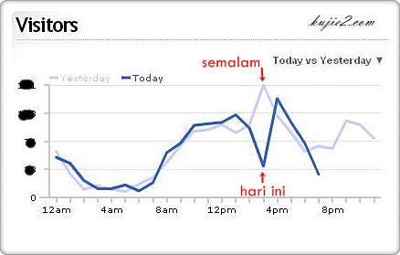 Balik, tengok blog dah ok. Dah boleh akses. Cuma ada perbezaan besar mengenai graf visitor. Beza semalam dan hari ini adalah 109. Kebiasaannya itulah waktu puncak tetapi menjadi waktu menjunam dengan drastik sekali.