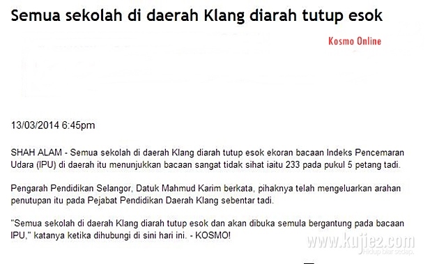 Jerebu kali ini rasa pelik sikit – tahap penglitan rasa macam teruk tapi bacaan IPU tak berapa tinggi sangat. Pelabuhan Kelang mencatatkan bacaan sangat tidak sihat dan semua sekolah di daerah Klang akan ditutup esok ( 14 Mac 2014 )