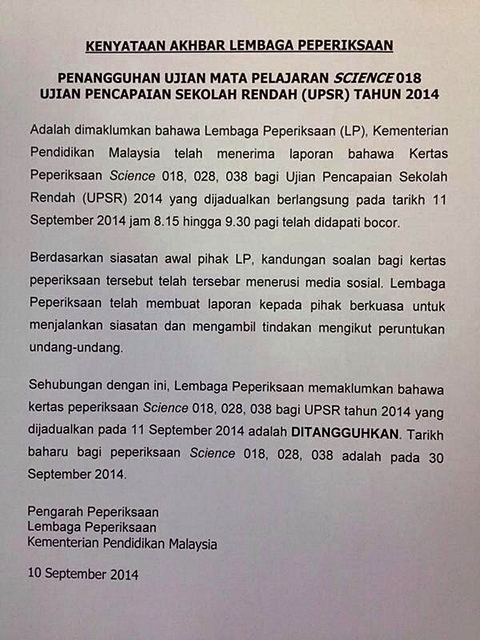 Kertas peperiksaan Science 018 bagi UPSR tahun 2014 yang dijadualkan pada esok 11 September 2014 ditangguhkan kerana didapati bocor. Lembaga Peperiksaan (LP) mendapati kandungan soalan bagi kertas peperiksaan tersebut telah tersebar menerusi media sosial.