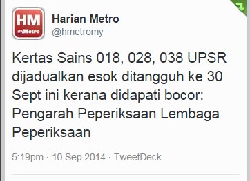 Peperiksaan UPSR untuk kertas sains esok ditangguhkan kepada tarikh 30 September 2014. Anak-anak dan mak-mak yang terlibat, moga dapat bertenang. Kesian anak-anak yang terpaksa tangguh “Hari Merdeka” mereka kerana ada orang yang tidak amanah pada tanggungjawap.