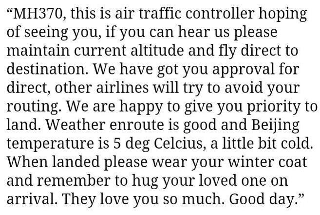 Saya tak pasti siapa yang tulis nota yang diambil dari laman Twitter ini tetapi air mata saya bergenang bila membaca nota tersebut. Tak kisahlah nota ni betul atau tidak, tetapi ianya tetap menyentuh hari sesiapa yang berharap. Semua orang mendoakan keselamatan penumpang dan anak kapal MH370 yang hilang tersebut.