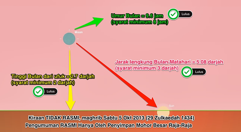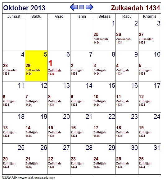 Begitu juga kalau kita buat semakan mengikut Unit Falak Fakulti Pengajian Kontemporari Islam Universiti Sultan Zainal Abidin (UniSZA), dijangka 1 Zulhijjah 1434 bersamaan 6 Oktober 2014.
