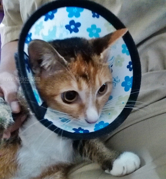 Doktor nasihatnya Alice memasai E-Collar ( Elizabethan collar ). Saya dah lama ada E-Collar ni tetapi jarang bagi Alice pakai. Rasa kesian tengok dia tak selesa. Tiap kali pakai, Alice mesti gesel-geselkan kepala ke dinding atau apa saja barang untuk mengeluarkan benda ni.