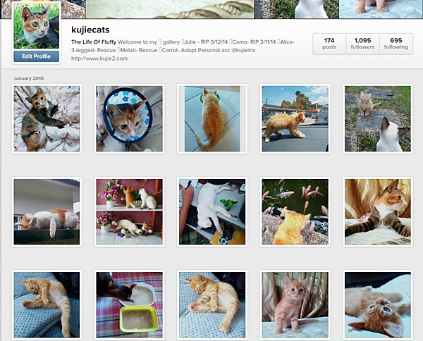Nota i : Ada yang tanya kenapa saya menggunakan Bahasa Inggeris di Instagram Kujiecats. Sebenarnya disebabkan akaun kucing tersebut mempunyai lebih ramai rakan pemilik kucing dari luar negara. Sesekali saya mengupdate menggunakan BM, banyak soalan yang di tanya ” what happen to Alice?” ” Is she still doing ok?’ ‘How did she lose her leg???’
