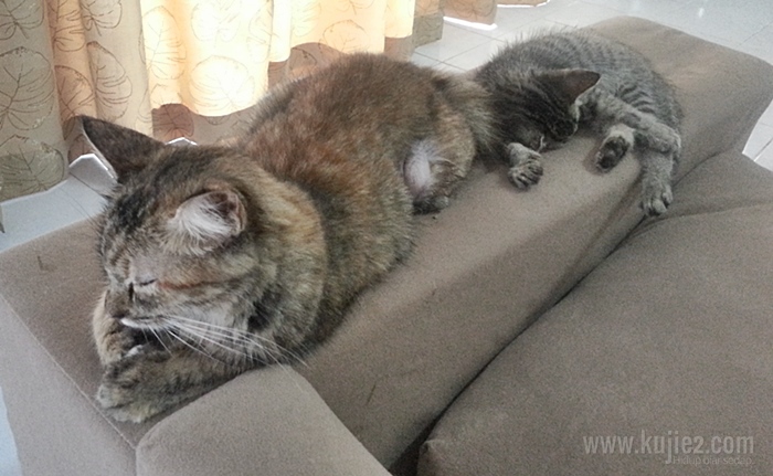Dua-dua kesayangan – kucing dan sofa. Ini adalah tempat kegemaran Julie dan nampaknya telah menjadi tempat lepak turun temurun anak beranak.