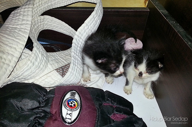 waktu balik dari sabah aritu, terdengar suara tangisan anak kucing dari dalam almari kasut kat garaj..tiga hari kemudian dah takde (kena pindah) sebab ada kucing jantan nak kaco ‘sarang’ anak kucing tu..