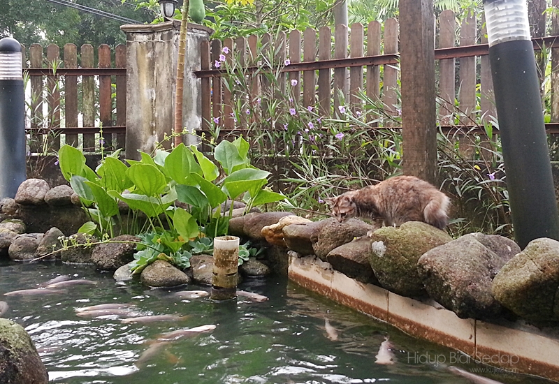 Rutin kami setiap pagi, keluar rumah dan duduk di taman sambil beri ikan makan. Waktu ini Julie akan melompat dari satu batu ke satu batu sambil menjilat air embun dan makan beberapa helai rumput.