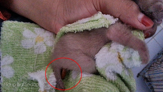 Anak kucing yang baru lahir tak tahu nak berak. Kalau dia tak berakt, akan timbul masalah keradangan perut, jadi kita kena rangsang dia untuk berak. Biasanya mak kucing akan menjilat bahagian tu.. tapi tak kan kita kena buat macam tu. hahahaa