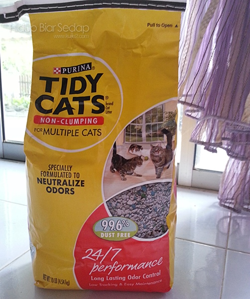 Pasir kucing yang saya gunakan adalah jenama Purina, Tidy Cats warba merah. Kat Tesco ada jual 2 jenis pasir kucing dari jenama ini.