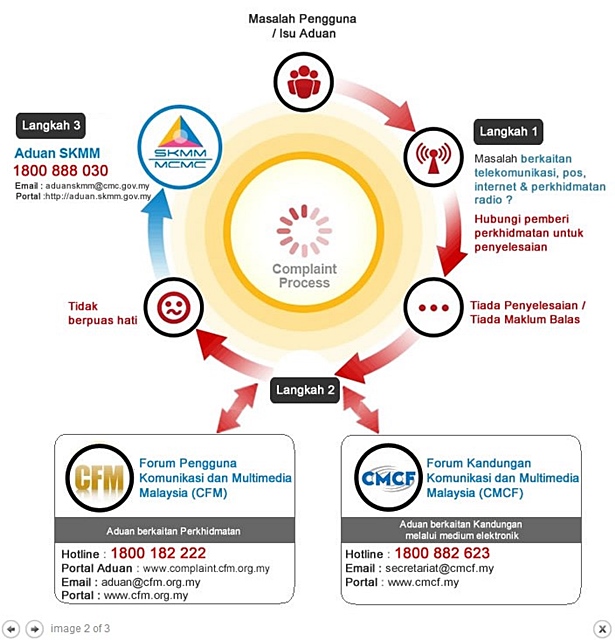 Kalau masalah ini tak selesai, kita boleh buat aduan melalui Forum Kandungan Komunikasi dan Multimedia Malaysia ( CMCF ) atau Forum Komunikasi dan Multimedia Malaysia ( CFM) atau melalui Suruhanjaya Komunikasi dan Multimedia Malaysia ( SKMM ).