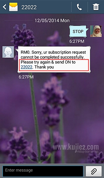 Atas nasihat kawan di Facebook, saya cuba menghentikan service dengan menghantar SMS STOP ke 22022.